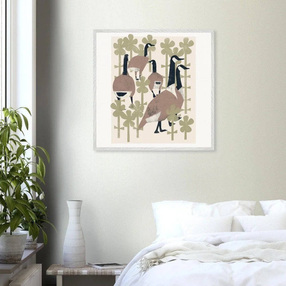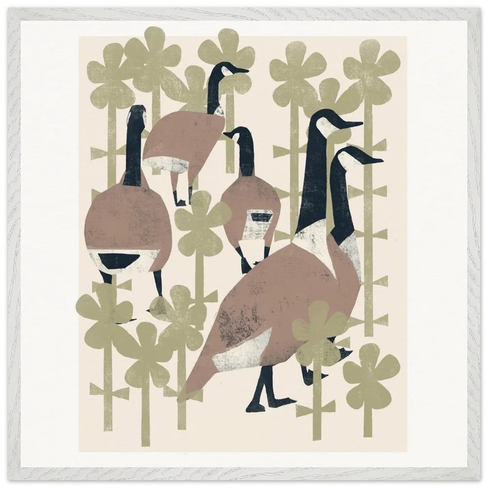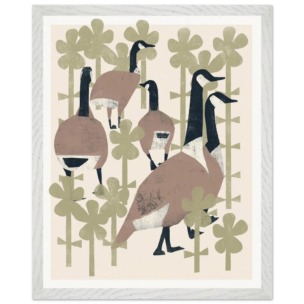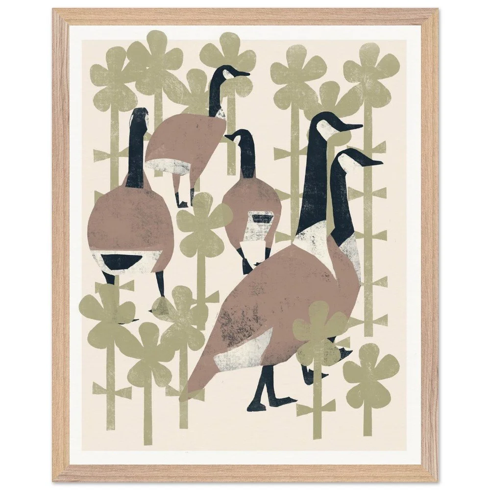 Geese In Flowers Premium Wooden Frmd Poster W/ Museum-Quality Matte Paper